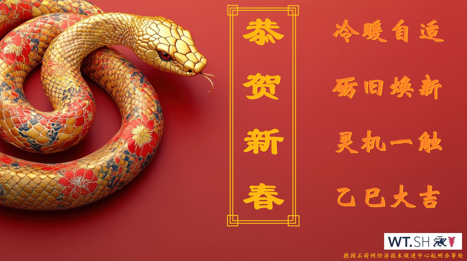 值此新春佳节到来之际,我们德国石荷州经济技术促进中心(WTSH)杭州办事处全体人员给您拜年啦!祝您阖家欢乐、蛇年行运、巳巳如意!